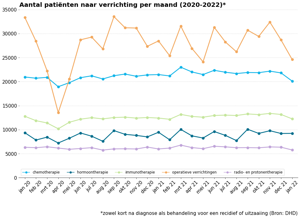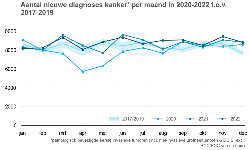 In bovenstaande grafieken wordt het aantal nieuwe kankerpatiënten per maand in 2020, 2021 en 2022 vergeleken met de periode 2017-2019. Basaalcelcarcinomen (BCC) en plaveiselcelcarcinomen (PCC) van de huid komen erg veel voor en zijn vrijwel nooit levensbedreigend, daarom zijn deze niet opgeteld bij het totaal van kankerpatiënten.
