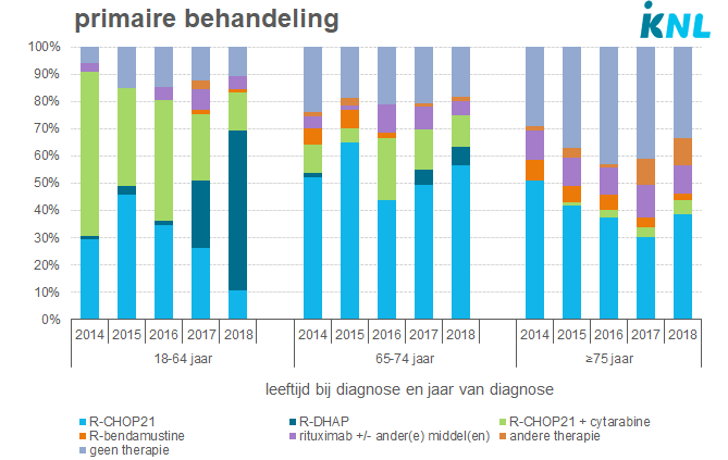 In de periode 2017-2018 vond een grote verandering plaats in de behandeling van patiënten in de leeftijd van 18 tot en met 64 jaar. Deze patiënten werden vaker behandeld met alternerend R-CHOP/R-DHAP. Dit schema werd nauwelijks toegepast bij patiënten in de leeftijd van 65 jaar en ouder. Dit geldt in zekere mate ook voor een behandeling met R-CHOP21 gevolgd door hoge dosis cytarabine.