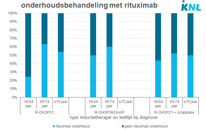Van de patiënten die met R-CHOP21 werden behandeld in de periode 2014-2018, kreeg 47% een onderhoudsbehandeling met rituximab. Het aandeel dat een onderhoudsbehandeling met rituximab kreeg is het hoogst bij patiënten in de leeftijdscategorie 65-74 jaar (63% versus 24% en 54% bij patiënten in de leeftijd van 18-64 jaar en 75 jaar en ouder).