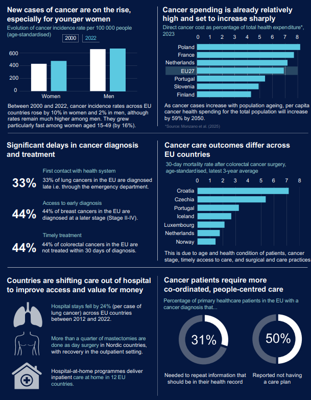 The report points to several urgent developments. For example, cancer among young women in Europe is increasing relatively quickly. Between 2000 and 2022, the number of cancer diagnoses (incidence) in EU countries rose by 10 percent among women and by 2 percent among men. The strongest growth was seen among women aged 15 to 49, where incidence increased by 16 percent. Although the total number of new cancer diagnoses among men is still higher, the picture is clearly shifting in younger age groups. This means that more women are confronted with years of treatment and follow-up at a young age, with a major impact on quality of life, work, and financial security, and with long-term pressure on healthcare systems. At the same time, the report identifies three priorities to create more value: