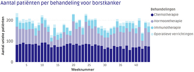 De effecten kunnen per tumorsoort verschillen. Als voorbeeld toont onderstaande figuur de aantallen verrichtingen voor borstkanker, waarin verrichtingen zijn opgenomen die zijn uitgevoerd zowel na de eerste diagnose als lange tijd na de diagnose en/of bij recidief/uitzaaiingen. De figuur laat vooral een grote daling in diagnostiek in het voorjaar van 2020 zien. Het aantal behandelingen is ook gedaald, maar veel minder dan het aantal diagnostische verrichtingen.