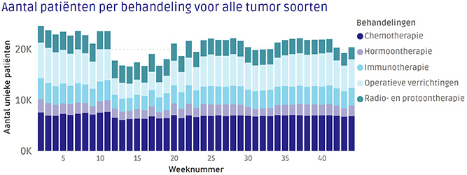 De toepassing van hormoon- en immunotherapie is voor het totaal van alle patiënten met kanker in het voorjaar 2020 licht gedaald. Het aantal behandelingen met chemotherapie is nauwelijks veranderd en laat een vrijwel stabiel beeld door het jaar zien. Het kan zijn dat op basis van de aangepaste protocollen de dosering of het aantal giften/fracties of kuren van chemotherapie, immunotherapie, hormoontherapie en radiotherapie anders is geweest dan voor de coronacrisis. Onderstaande figuur laat het aantal behandelde patiënten per week zien. Het totaal aantal behandelingen is in de zomer en najaar van 2020 lager gebleven dan in de eerste weken van 2020, met name door een afname van het aantal operatieve verrichtingen. Onderstaande figuren geven het totaal aantal kankerbehandelingen voor zowel nieuw gediagnosticeerde patiënten als voor patiënten die al lange tijd onder behandeling zijn voor de primaire tumor en/ of recidieven en uitzaaiingen. Voor radiotherapie zijn de gegevens niet compleet omdat niet alle radiotherapeutische instellingen data hebben aangeleverd.