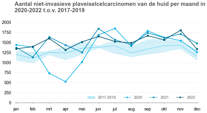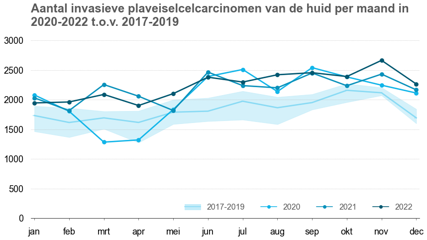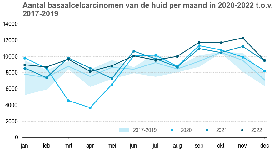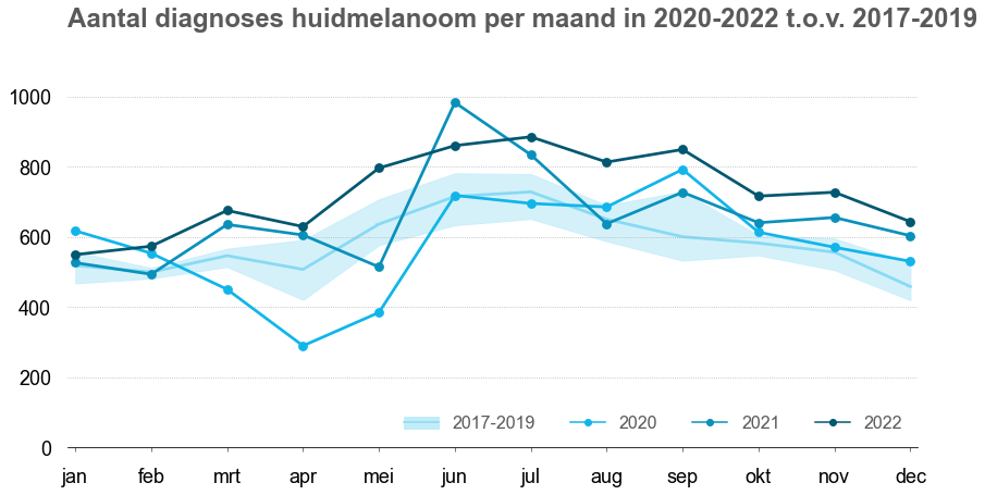 Onderstaande figuren tonen het aantal nieuwe diagnoses per maand (pathologisch bevestigde eerste tumoren) voor 2022, 2021 en 2020 vergeleken met 2017-2019.