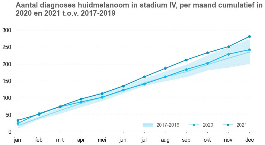 Specifiek voor stadium-IV-melanomen is te zien dat het cumulatieve aantal in januari, februari en maart 2020 hoger was dan in de jaren er voor. Vanaf maart is er geen verschil waarneembaar in de cumulatieve incidentie in 2020 en de jaren er voor. In 2020 en 2021 zijn niet meer diagnoses in stadium IV gesteld dan in eerdere jaren.
