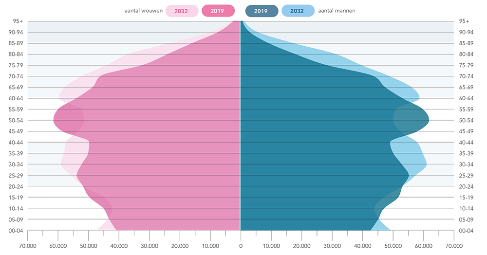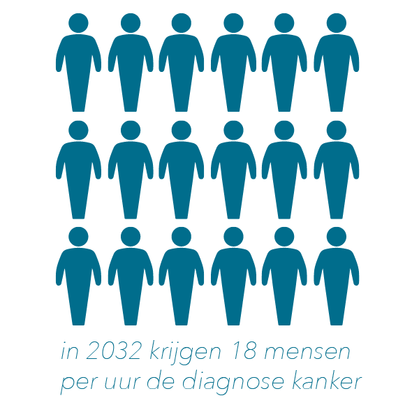 Het jaarlijkse aantal nieuwe kankerdiagnoses neemt de komende tien jaar flink toe. In 1989 werden bijna 56.000 kankerdiagnoses gesteld, in 2019 ging het al om ruim 118.000 en in 2032 zullen er ongeveer 156.000 nieuwe diagnoses zijn. Dit komt erop neer dat over tien jaar gemiddeld 18 mensen per uur geconfronteerd zullen worden met de diagnose kanker. Deze sterke toename komt vooral door de groei en dubbele vergrijzing van de Nederlandse bevolking: we krijgen te maken met meer ouderen, die bovendien ook steeds ouder worden. Omdat kanker vaker voorkomt op hogere leeftijd, neemt vooral het aantal oudere patiënten toe. Daarnaast wordt de toename in kankerdiagnoses veroorzaakt door veranderingen in leefstijlfactoren die het risico op kanker verhogen, zoals roken, alcoholgebruik, weinig lichaamsbeweging, overgewicht en blootstelling aan uv-straling van de zon en zonnebanken. Zo neemt het aantal huidkankerdiagnoses met ruim 40% toe in de komende tien jaar en is er een opvallende stijging van kankersoorten gerelateerd aan overgewicht, zoals lever-, galweg- en nierkanker. Tenslotte wordt de toename van het aantal kankerdiagnoses voor een beperkt deel verklaard door verbeterde (vroeg)diagnostiek, waardoor kleine tumoren worden gevonden die eerder niet werden opgespoord.