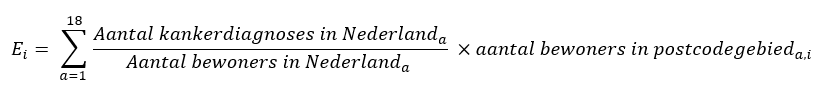 Hierin is E_i het verwachte aantal kankerdiagnoses in gebied i. a staat voor de leeftijdscategorie: leeftijdscategorie 1 bevat de leeftijden 0-5 en leeftijdscategorie 18 de leeftijden 85 en ouder. Deze berekening is een vorm van indirecte standaardisatie. Dit zorgt ervoor dat verschillen tussen gebieden niet toe te schrijven zijn aan een oudere of jongere bevolking in die gebieden en ook niet aan verschillen in populatiegrootte tussen gebieden.