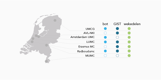 Ook voor diagnostiek en behandeling van wekedelensarcomen en GIST bestaan er erkende expertisecentra (zie onderstaand kaartje). Operaties van wekedelensarcomen en GIST’en vinden gedeeltelijk plaats binnen deze expertisecentra (51% en 35%, respectievelijk). Daar waar patiënten behandeld worden buiten de expertisecentra is het essentieel dat in het multidisciplinair overleg (MDO) de inbreng vanuit de expertisecentra geregeld is.