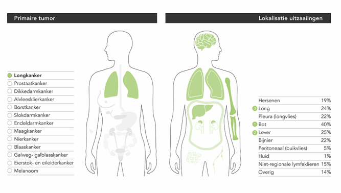 De helft van de patiënten met longkanker heeft uitzaaiingen bij diagnose. In 2018 ging het om 7.030 patiënten. Hiermee is het tevens de grootste groep patiënten met uitzaaiingen bij diagnose. Longkanker zaait het vaakst uit naar de botten, lever en de andere long. Klik op onderstaande infographic om de locaties van uitzaaiingen voor andere kankersoorten te zien.
