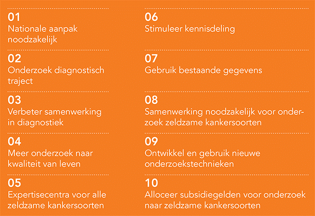 De auteurs van rapport: Kankerzorg in beeld: zeldzame kanker pleiten samen met medici, beleidsadviseurs en onderzoekers, voor een nationaal plan ter verbetering van onderzoek en zorg voor patiënten met zeldzame kanker. Dit plan moet leiden tot duurzaam beleid om de zorg (coördinatie), kennisoverdracht en wetenschappelijk onderzoek te concentreren in erkende expertisecentra en bijbehorende kennisnetwerken.