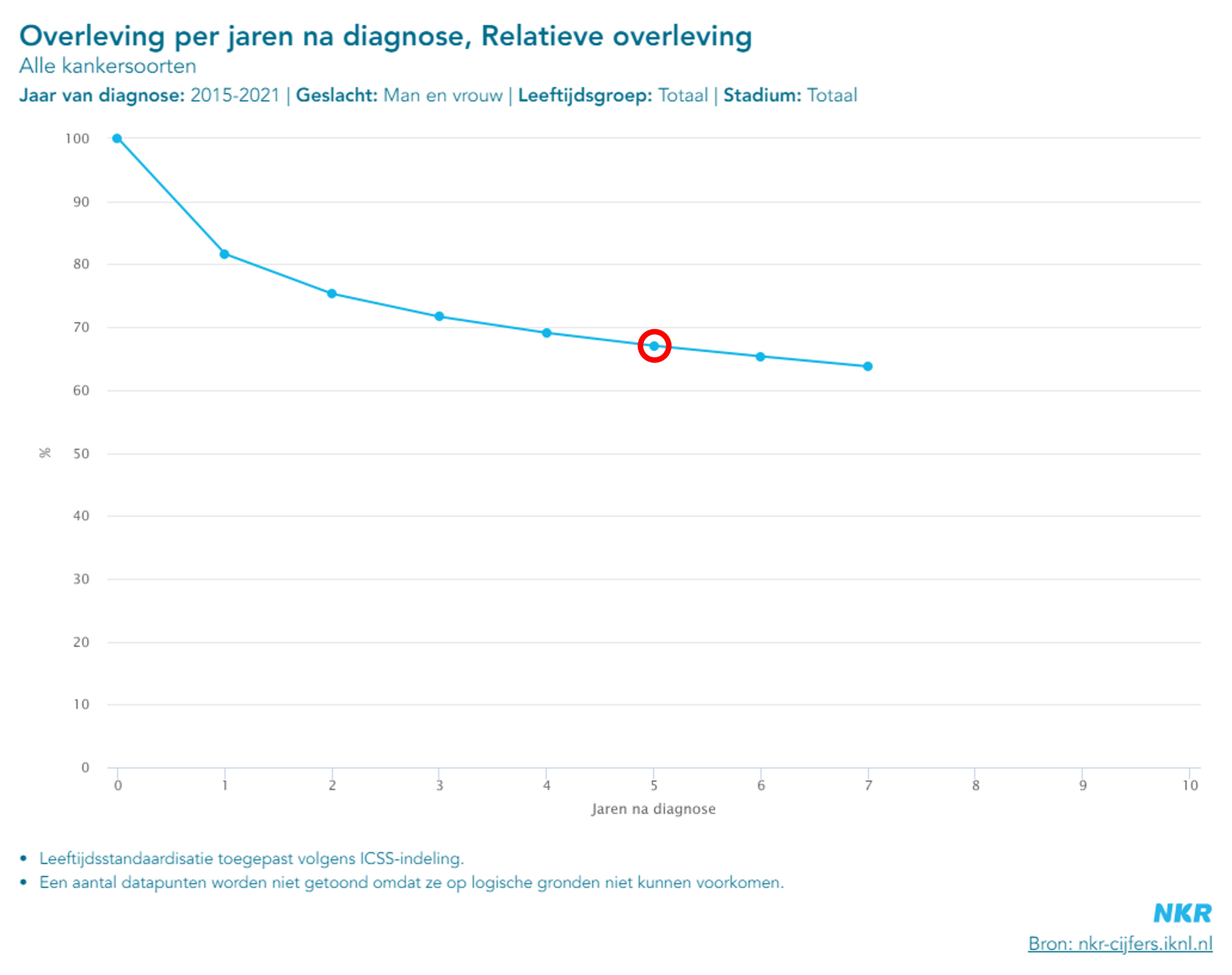 Overleving op NKR Cijfers betreft het percentage patiënten dat na een bepaald aantal jaren na diagnose nog in leven is. Het betreft de relatieve overleving, de kans op overleving in een hypothetische wereld waarin geen andere doodsoorzaken bestaan. Deze correctie geeft een overlevingspercentage welke een benadering is voor de zogeheten kankerspecifieke overleving.