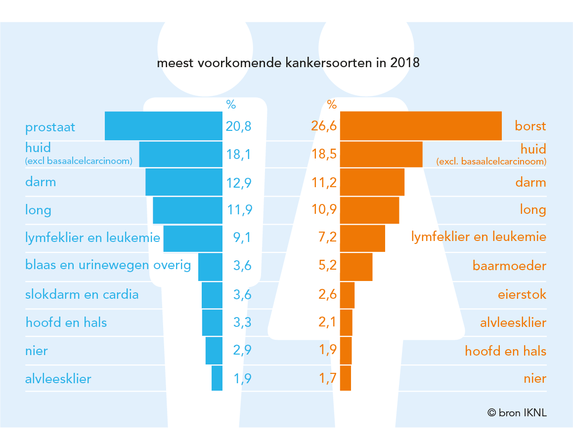 Bij vrouwen is borstkanker de meest voorkomende kankersoort met 15.000 nieuwe diagnoses in 2018. Dit is 26.6% van alle kankerdiagnoses bij vrouwen. Bij mannen komt prostaatkanker het vaakst voor met 12.500 nieuw gediagnosticeerde patiënten (20,8%).