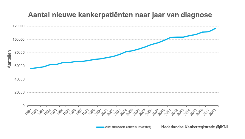 Het jaarlijkse aantal mensen dat de diagnose kanker krijgt is de afgelopen drie decennia verdubbeld, van 56.000 in 1989 naar 116.000 in 2018. Dat blijkt uit de Nederlandse Kankerregistratie. De stijging wordt met name verklaard doordat de bevolking sterk is gegroeid en dan vooral het aantal ouderen, bij wie kanker het meeste voorkomt. Gecorrigeerd voor de toename van de gemiddelde leeftijd, steeg het percentage mensen dat kanker krijgt tussen 1989 en 2011 gestaag en is sindsdien op hetzelfde niveau gebleven. Huidkanker is hierop een uitzondering, er is met name in het laatste decennium een sterke stijging in het aantal mensen dat huidkanker krijgt.